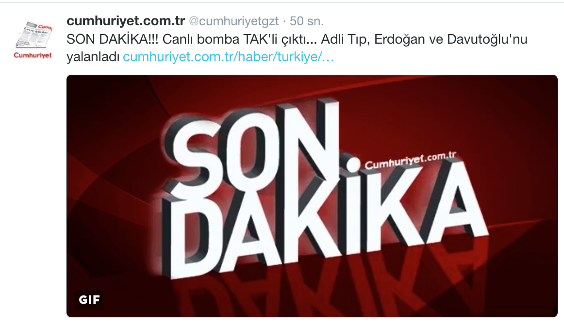 FETÖ ile PKK ortaklığının tetikçi gazetesi Cumhuriyet, tüm bu gerçeklere rağmen ciddi bir çarpıtmayla teröristi ve terör örgütünü savunup, Türkiye Cumhuriyeti’nin Cumhurbaşkanı ve Başbakanını yalancılıkla itham etti. Cumhuriyet, “Ankara’daki bombalı saldırıyı gerçekleştirenin ismi açıklanan Salih Necar değil TAK’nin açıkladığı gibi Abdulbaki Sömer olduğu DNA sonuçlarıyla kesinleşti.” diyerek Sömer’in “Salih Necar” adıyla kendini kaydettirip sınırdan girdiği gerçeğini yazmadı. YPG’li terörist Sömer’in sınırdan “Salih Necar” adına kayıt olup Türkiye’ye girdiği gerçeğini gizleyip, bombacının TAK’lı olduğu yani YPG’li çıkmadığı dolayısıyla da Erdoğan ve Davutoğlu’nun yalan söylediği gibi tamamen YPG terör örgütünü kollayan bir algı operasyonu yaptı.