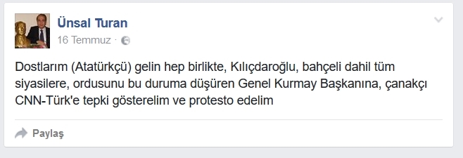 TRT’de darbe bildirisinin okunduğu dakikalarda Facebook sayfasında TRT 1 canlı yayın bağlantısını paylaşan Doğan Medya’nın Danimarka muhabiri Turan, gecenin ilerleyen saatlerinde kendilerine bağlı olan CNN Türk’ün yaptığı yayınlara ve muhalefet liderlerine tepki gösteren şu paylaşımı yapıyor: “Dostlarım (Atatürkçü) gelin hep birlikte, Kılıçdaroğlu, Bahçeli dahil tüm siyasilere, ordusunu bu duruma düşüren Genel Kurmay Başkanına, çanakçı CNN-Türk’e tepki gösterelim ve protesto edelim”