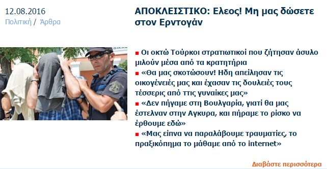 Siyasi sığınma başvuruları ile ilgili 19-25 Ağustos tarihleri arasında Atina’daki İltica Komisyonu’na ifade verecek olan 8 asker, Yunanistan’a beraberlerinde bir “CIA ajanı ile kaçtıklarına” ilişkin Türk medyasında çıkan haberleri de reddettiler. “Helikopterde sadece bizler vardık. Kesinlikle 9’uncu bir kişi yoktu” dediler.