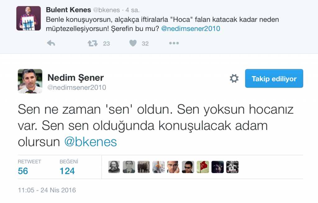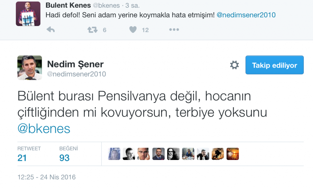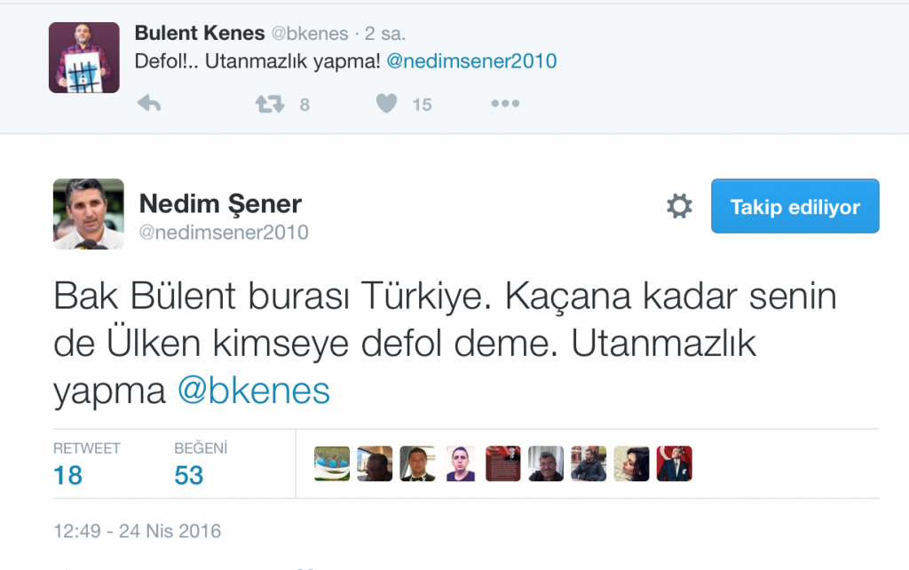 Fetocu terör örgütünün gazeteci kılığıyla ortalığa saldığı militanlarının kirli, küfürlü ve çirkin dilleri, Fetocuların nasıl kötülük çukurunda olduklarının da göstergesi. FETÖ’nün en müptezel küfürbazlarından Bülent Keneş’e Twitter’da gazeteci Nedim Şener fena haddini bildirdi. Keneş sadece küfür ve hakaretler ederken, Şener onun bir FETÖ militanı olarak sadece efsunlanmış bir robot olduğunu “Sen yoksun hocanız var. Sen sen olduğunda konuşulacak adam olursun” şeklindeki çarpıcı yorumuyla ortaya koydu…