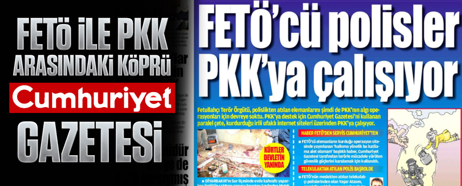 Terör örgütü PKK’ya destek vererek vatana ihanette sınırları zorlayan Fetullahçı Terör Örgütü (FETÖ), polislikten atılan elemanlarını şimdi de PKK’nın bölücü algı operasyonları için kullanmaya başladı. PKK’ya destek için kendi gazeteleri yerine Cumhuriyet Gazetesi’ni kullanmayı tercih eden paralel çete, bazı elemanlarına kurdurduğu irili ufaklı internet gazeteleri üzerinden PKK bölücülüğüne hizmet için ürettiği uydurma haberleri Cumhuriyet’e servis ediyor.