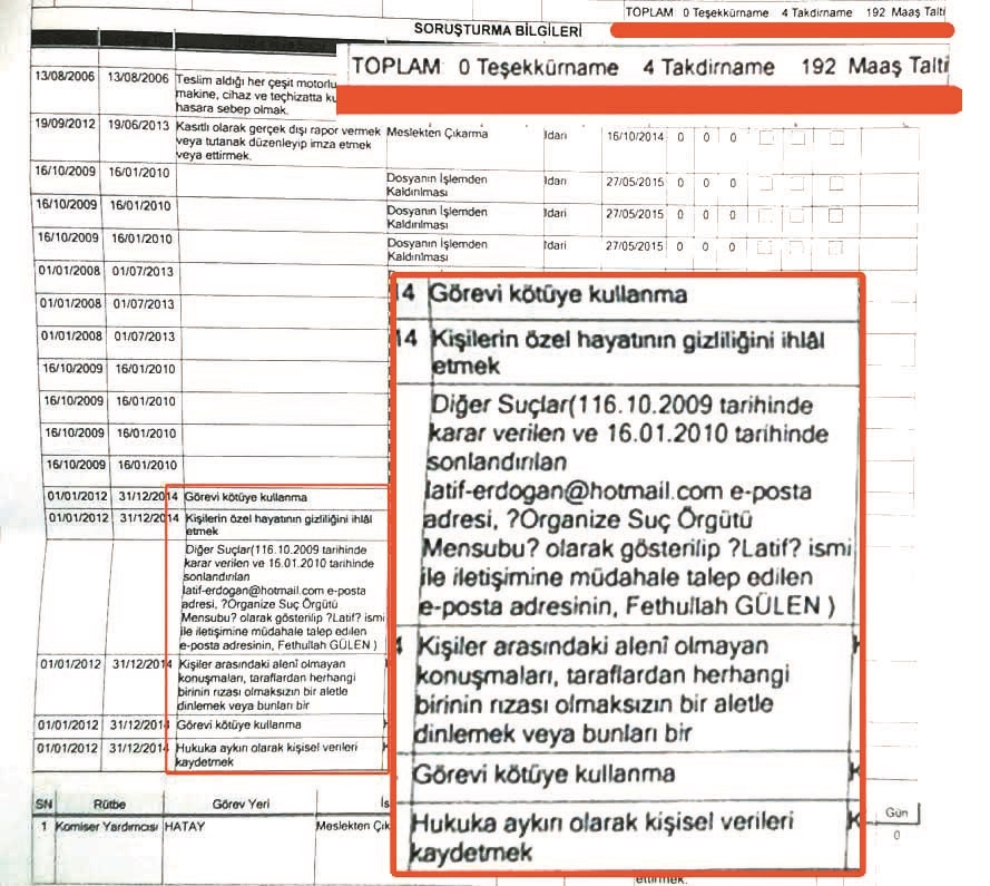 2003 yılında mesleğe giriş yapan, FETÖ’nün güç kazandığı dönemde birçok özel kursa gönderilen ve Paralel yapının 2010 yılında çaldığı sınav sorularıyla Komiser Yardımcılığına yükselen Atasev’in sicili, paralel yapıyla bağını da ortaya koyuyor. Aralarında yazarımız Latif Erdoğan’ın da bulunduğu birçok ismi yasadışı olarak dinlediği için hakkında açılan soruşturma sonucu 26 Aralık 2014’te meslekten atılan Atasev’in, görev yaptığı 138 aylık meslek hayatında tam 192 maaş taltifle ödüllendirildiği ortaya çıktı.