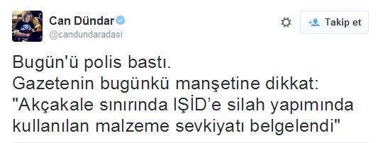 17-25 Aralık operasyonunun ardından paralel örgütün taşeronluğunu yapan Cumhuriyet gazetesinin Genel Yayın Yönetmeni Can Dündar bu sabah paylaştığı tweet, Gülencilerin IŞİD haberini kullanarak operasyona kalkan yapma çabası olduğu iddialarını güçlendirdi.