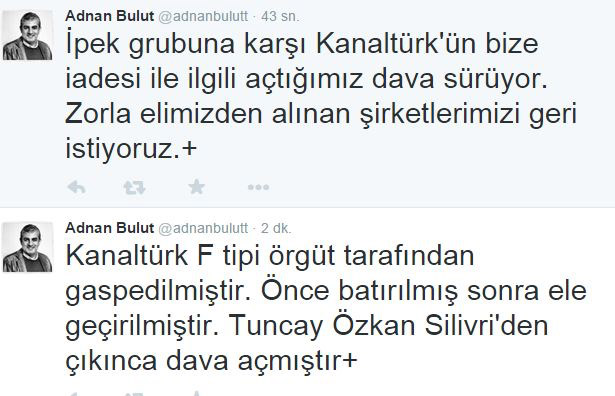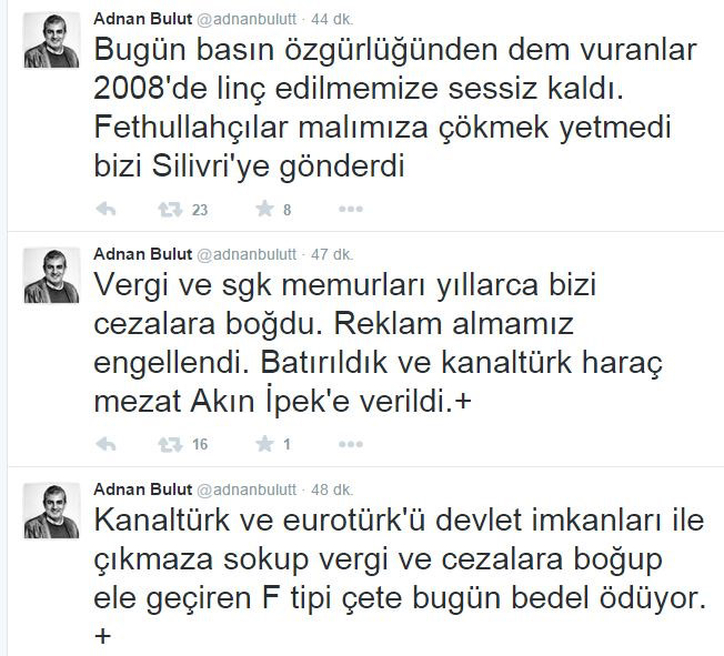 Kanaltürk Televizyonu’nun eski haber müdürü Adnan Bulut, “Kanaltürk ve Eurotürk’ü devlet imkanları ile çıkmaza sokup vergi ve cezalara boğup ele geçiren F tipi çete bugün bedel ödüyor” dedi.