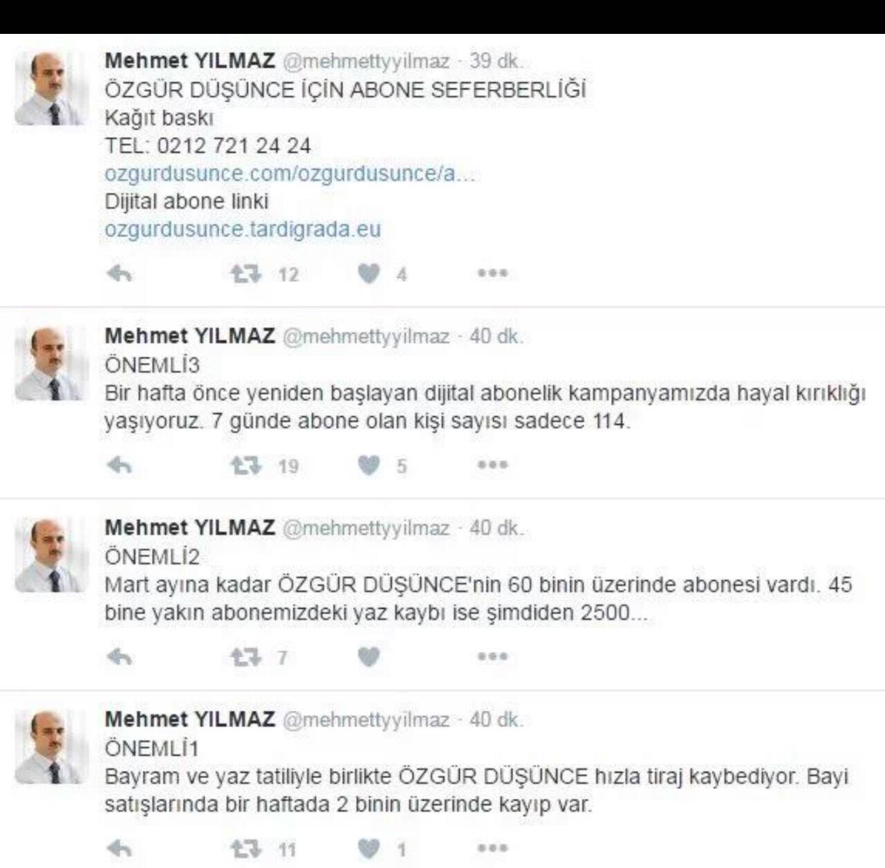 Düzenledikleri tiraj kampanyasına rağmen bir haftada sadece 114 kişinin abone olduğunu kaydeden Mehmet Yılmaz, gazetenin hergün tiraj kaybettiğini sitem dolu cümlelerle yazdı. Tweetlerinin ardından Yılmaz hesabından telefon numarası yayınlayarak yalvarırcasına okuyucuların gazeteye abone olmalarını istedi.