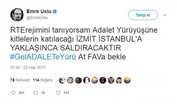22 Haziran’da Twitte hesabından, “RTE rejimini tanıyorsam Adalet yürüyüşüne kitlelerin katılacağı İzmit, İstanbul’a yaklaşınca saldıracaktır… #GelADALETeYürü at FAVa bekle” diye yazan FETÖ’cü Uslu CHP yürüyüşüne AK Parti’lerin saldırı planladığı algısı yaratmaya çalıştı.