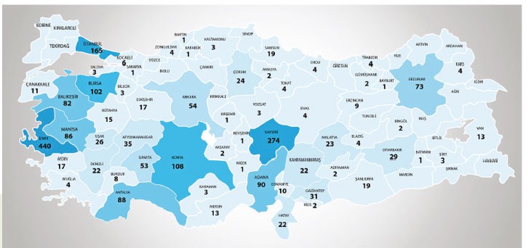 Vakıflar Genel Müdürlüğü’ne devredilen 2 bin 87 tapunun dağılımına bakıldığında ise İzmir 440 tapuyla ilk sırada yer aldı. Kayseri’de 274, İstanbul’da 165,Konya’da 108, Bursa’da 102 tapu Vakıflar’a devredildi. Fettullah Gülen’in memleketi Erzurum’da 73 tapu Vakıflar’a devredildi. Hakkari ve Çankırı yine el konulan tapunun olmadığı iki kent olurken, Siirt’te 3 tapu Vakıflar’a devedildi. Ankara’da Vakıflar’a devredilen tapu sayısı 54, Adana’da 90, Manisa’da 84 oldu.