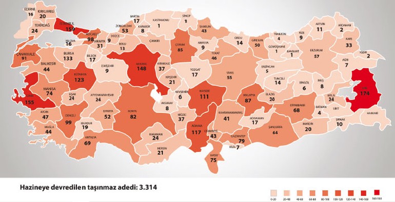 Hazine’ye devredilen 3 bin 314 tapunun illere göre dağılımına bakıldığında Van’ın ilk sırada olması dikkat çekti. 174 tapulu Van’ı, İstanbul 159, İzmir 155, Ankara 148, Kütahya 123, Adana 117, Kayseri 111 tapuyla izledi. Hakkari, Siirt ve Çankırı’da el konulan tapu olmazken, Tunceli’de 14 tapu Hazine’ye devredildi. Kastamonu, Sinop, Gümüşhane ve Bayburt’ta ise devredilen tapu sayısı 1 oldu.