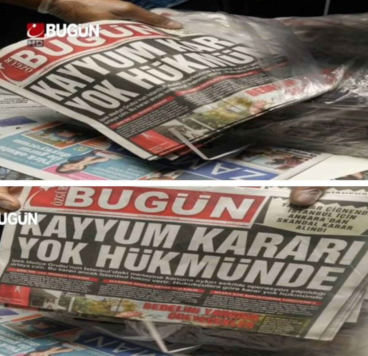 Bakırkoy 3. Sulh Ceza Hakimliği ‘nden alınan kararla BUGÜN ve MİLLET Gazetelerinin korsan olarak ‘ÖZGÜR BUGÜN’ ve ‘ÖZGÜR MİLLET’ basımının yapılması durduruldu.