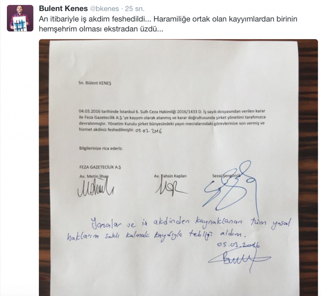 FETÖ’nün ağzı bozuk küfürbaz trol tiplerinden Cumhurbaşkanı Erdoğan ve Başbakan Davutoğlu’na küfür ve hakaretleri nedeniyle defalarca gözaltına alınıp tutuklanan Bülent Keneş, kayyum yönetimi tarafından Today’s Zaman gazetesinden kovuldu. Keneş kovulduğunu Twitter’da duyurdu.
