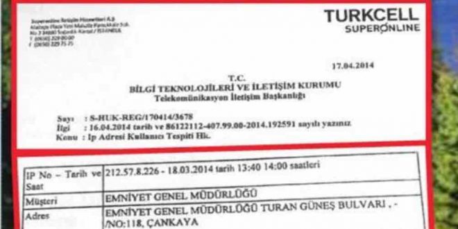 Aklınıza hemen MİT gelmesin. IP adresini de vereceğim. Daha doğrusu hesabın adresini veren ben değilim. Turkcell Superonline tarafından 17.04.2014 tarihinde Bilgi Teknolojileri ve İletişim Kurumu’na gönderilen, ‘IP Adresi Kullanıcı Tespiti Hakkındaki’ yazıda, ‘bascalan’ hesabının açıldığı ve aktif olarak yönetildiği adresi olarak, ‘Emniyet Genel Müdürlüğü’ gösteriliyor.