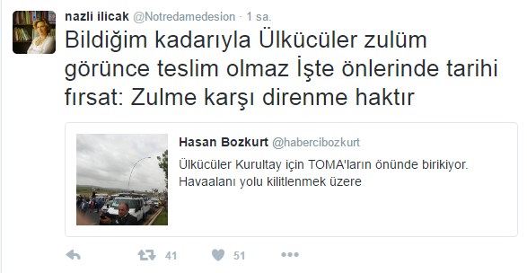 Ankara’daki gergin bekleyiş sürerken, TOMA’ların önünde beklendiğini gören FETÖ’nün ablası Nazlı Ilıcak, MHP’li muhaliflere TOMA’lara karşı direnmeleri için çağrı yaptı ve “Bildiğim kadarıyla Ülkücüler zulüm görünce teslim olmaz. İşte önlerinde tarihi fırsat: Zulme karşı direnme haktır” dedi. FETÖ’nün firari tetikçilerinden Emre Uslu ise dün yaptığı paylaşımda, “Sonunda Ülkücüler de TOMA’yla tanışıyor” ifadelerini kullandı.