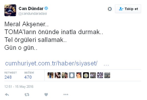 Casusluk suçundan yargılanan Cumhuriyet’in Genel Yayın Yönetmeni Can Dündar da “Meral Akşener… TOMA’ların önünde inatla durmak… Tel örgüleri sallamak… Gün o gün…” şeklinde paylaşımda bulundu.