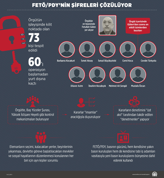 AA muhabirinin emniyet yetkililerinden aldığı bilgilere göre, devletin, tüm birimleri ile topyekun mücadele ettiği FETÖ/PDY’ye yönelik operasyonlar, örgütün yapısını ve işleyişini de deşifre ediyor. Ankara Emniyet Müdürlüğü Terörle Mücadele Şube Müdürlüğü ekiplerinin 17-25 Aralık operasyonlarından sonra yaptıkları başarılı çalışmalar da bu yapının deşifresinde önemli rol oynuyor. En son cuma günü yapılan operasyon, haklarında gözaltı kararı çıkarılanların tamamı örgütün kilit isimleri olduğu için, öncekilerden farklılık arz ediyor.