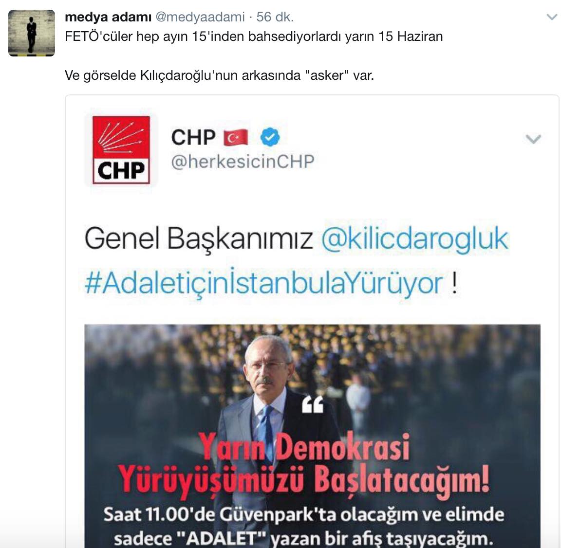 Ancak, “Demokrasi yürüşümüzü başlatıyorum, elimde sadece ‘adalet’ yazan bir afiş taşıyacağım” diyen Kılıçdaroğlu’nun söyleminin aksine, Kılıçdaroğlu’nun parti mitinglerinde vatandaşlarla buluşmasını anlatan bir fotoğraf yerine, Anıtkabir ziyaretinden olduğu tahmin edilen ve arkasında ordu mensuplarının yer aldığı bir fotoğrafın afişte kullanılması dikkat çekti.