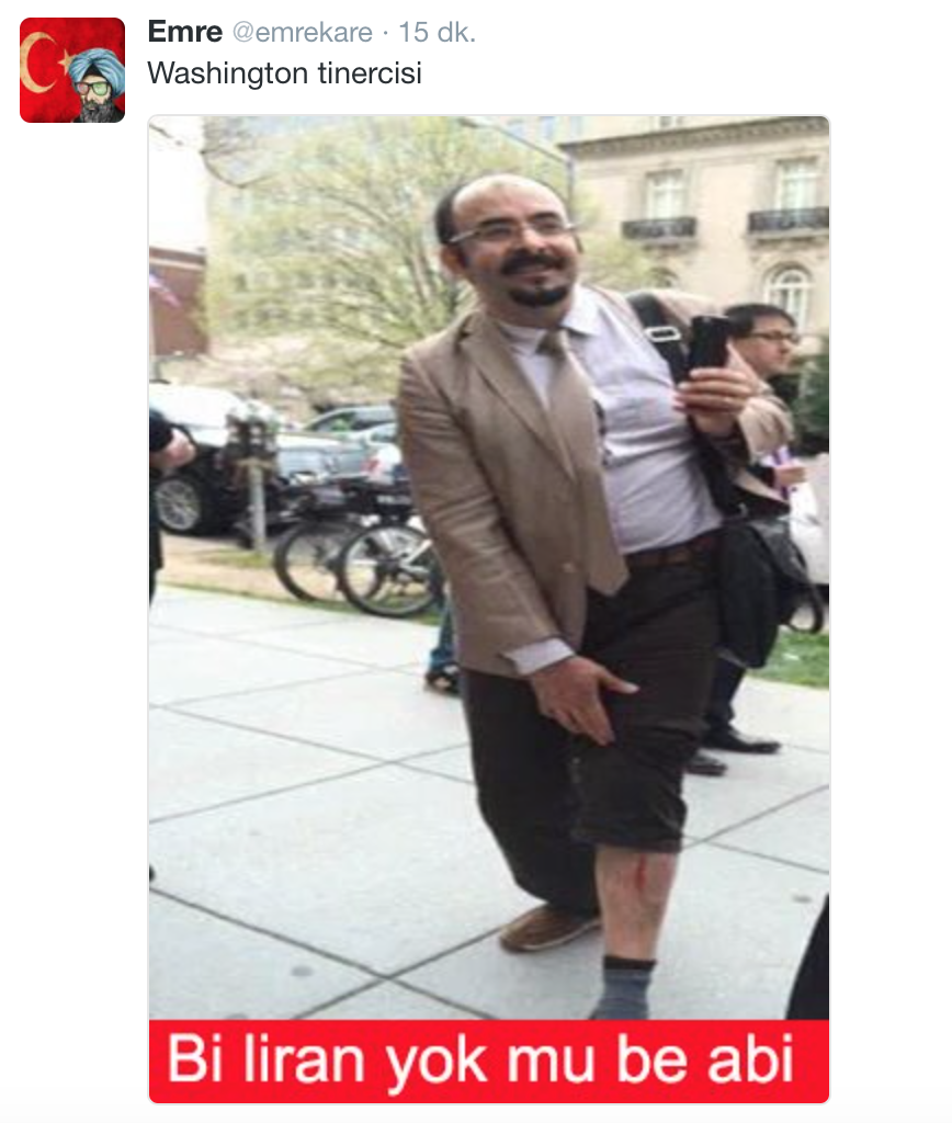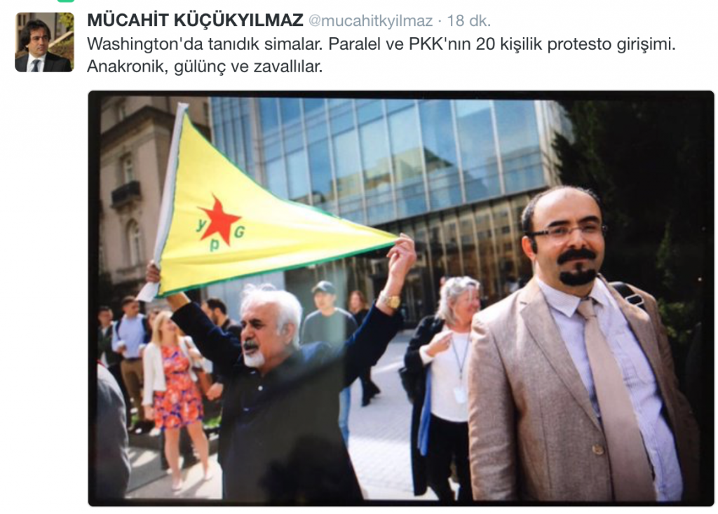 FETÖ’nün kaçak teröristi Emre Uslu, Cumhurbaşkanı Erdoğan’ın Brookings Enstitüsü’ndeki konuşması öncesi salon dışında PKK’nın Suriye’deki kolu YPG’nin paçavrası altında poz verip provokasyon yaparken yakalandı. FETÖ’nün PKK ile ortaklığı okyanus ötesinde ortaya çıktı.