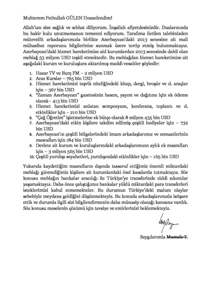 İşte bir örgüt mensubunun Fethullah Gülen’e yazdığı Azerbaycan’daki paralel yapının mali boyutunu da gözler önüne seren belge: