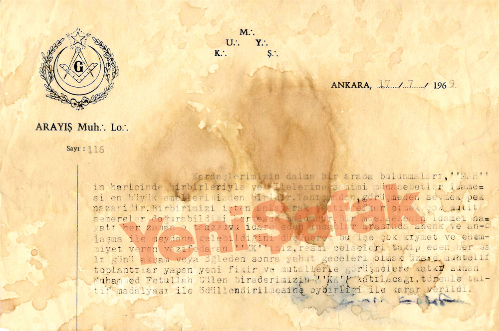 Belgenin üst kısmında “Arayış Muh: Lo:” şeklinde bir ibare, sayı kısmında ise “116″ yazıyor. Gülen’in masonlar için çok kritik bir isim olduğunu ortaya belgede şu ifadeler yeralıyor: “Kardeşlerimizin daima birarada bulunmaları, ‘MAH’in haricinde birbirleriyle ve ailelerine samimi münasebetler idamesi en büyük emellerimizden biridir. Tanışmadan, görüşmeden sevmek pek nazaridir. Birbirimizi içten anlayarak teati efkar etmek çok mutit semereler doğurabildiği herkesce malumdur. Bir müessesenin idamei hayatı her zaman o taazzuvu idare eden insanlar arasında ahenk ve anlaşma ile meydana gelebildiğini düşünerek bu işe çok kıymet ve ehemmiyet veren vazifederan ‘KK’iniz, resmi celseleri takip eden her Salı günü akşam veya öğleden sonra yahut geceleri olmak üzere muhtelif toplantılar yapan yeni fikir ve mutallerle görüşmelere katkı sunan Muhammed Fetullah Gülen biraderimizin ‘KK’ katılacağı törenle taltif madalyasıyla ödüllendirilmesine oy birliğiyle karar verildi.”
