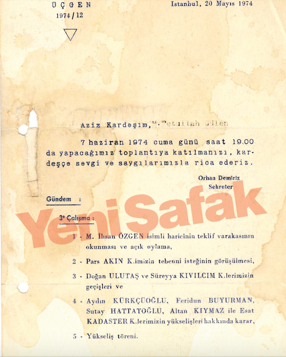 21 Nisan 1974 tarihli ‘Orhan Demiriz/Sekreter’ imzalı davetiyede, “Aziz Kardeşim, M. Fetullah Gülen. 10 Mayıs 1974 Cuma günü saat 19.00’da yapacağımız toplantıya katılmanızı, kardeşçe sevgi ve saygılarımla rica ederim” deniliyor.
