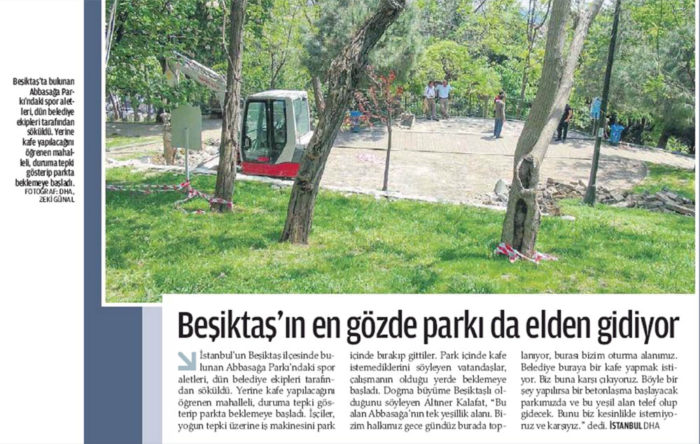 CHP’li Beşiktaş Belediyesi dün Gezicilerin mabedi Abbasağa Parkı’ma iş makineleriyle girdi Fetullahçı terör örgütünün amiral gemisi Zaman, olayı Ak Parti yapmış gibi bir algı oyunu çevirdi.