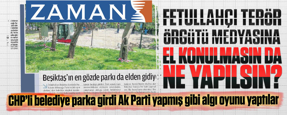 Fetullahçı terör örgütünün amiral gazetesi Zaman’da o haber CHP’li Beşiktaş Belediyesi’nin adı gizlenerek yayınlandı. Haberde Beşiktaş Belediyesi’nden hiçbir biçimde söz edilmeyerek sanki Ak Partili İstanbul Büyükşehir Belediyesi yapmış gibi bir algı oyunuyla “Beşiktaş’ın en gözde parkı da elden gidiyor” denildi.