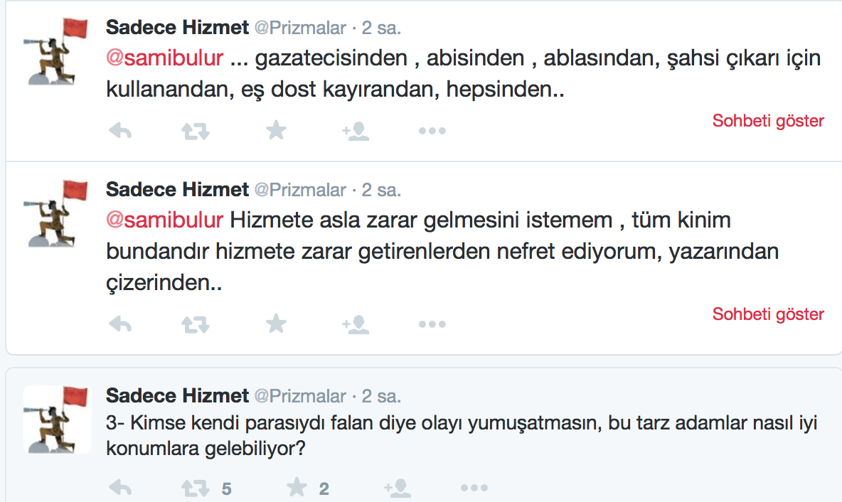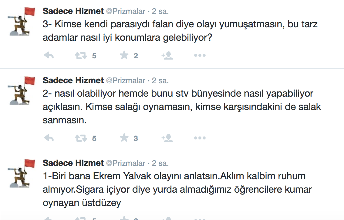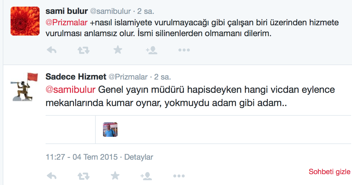 Himmet paralarını KKTC’de bir kumarhanede kumarda yediği ortaya çıkan Fetullahçı yönetici Ekrem Yalvak, Gülen örgütünü darmadağın etti. Fetullahçıların yaşadığı şok ve hayal kırıklığı sosyal medyaya da ilginç örneklerle yansıdı. Kafası karışan ve isyan eden bir Fetullahçı hesabı, kumarbaz paraleli eleştirdiği için diğeri “sorgulama, ismin silinenlerden olma” diye tehdit etti. İşte Fetullahçıların düştüğü zilletin ibretlik vesikası: