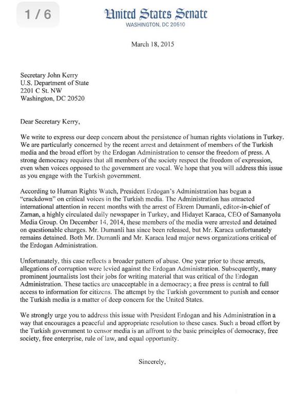 Bunun son örneği, bu yazıya başlamadan dakikalar önce yayımlanan, 74 senatörün imzaladığı, ABD DİB Kerry’ye hitaben yazılan “Türkiye’deki İnsan Hakları İhlalleri” konulu mektup. Mektupta bol bol Hidayet Karaca ve Ekrem Dumanlı motifleri mevcut. Türkiye’de basın özgürlüğünün kısıtlanmakta olduğundan dem vurulan bir kağıt parçası adeta.