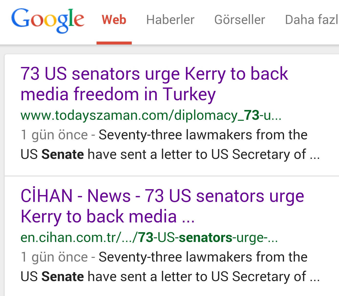 Bu haber daha sonra Cihan Haber Ajansı’nın İngilizce sayfasında da yer buldu fakat bir süre sonra oradan da kaldırılmış olduğu görüldü. Haberin içeriğine google cache yoluyla ulaşıldığında da, haberde yer alan mektubun, bugün yayınlanan mektupla aynı olduğu ortaya çıkıyor. Link burada: http://webcache.googleusercontent.com/search?q=cache:http://en.cihan.com.tr/en/news/73-US-senators-urge-Kerry-to-back-media-freedom-in-Turkey_6498-CHMTcwNjQ5OC8kbmV3c01hcFZhbHVlLntjYXRlZ29yeUlkfQ==