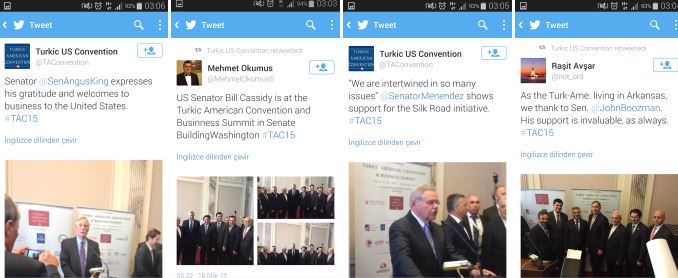 Dün DC’de, Paralel Örgüt’e yakınlığı herkesin malumu olan bir “çatı organizasyon” olan Turkic American Alliance’ın her yıl düzenlediği “Turkic American Convention” adlı bir etkinlik gözüme çarptı. Etkinliğin twitter hesabına girdiğimde, “senatörlerden mektup” haberinden yola çıkarak, organizasyona hangi senatörlerin katıldığına baktım. Sonuç çok da şaşırtıcı değil. Organizasyonda boy gösteren senatörlerin hepsinin, bugün yazılan mektupta imzası var. Bunları da paylaşayım: