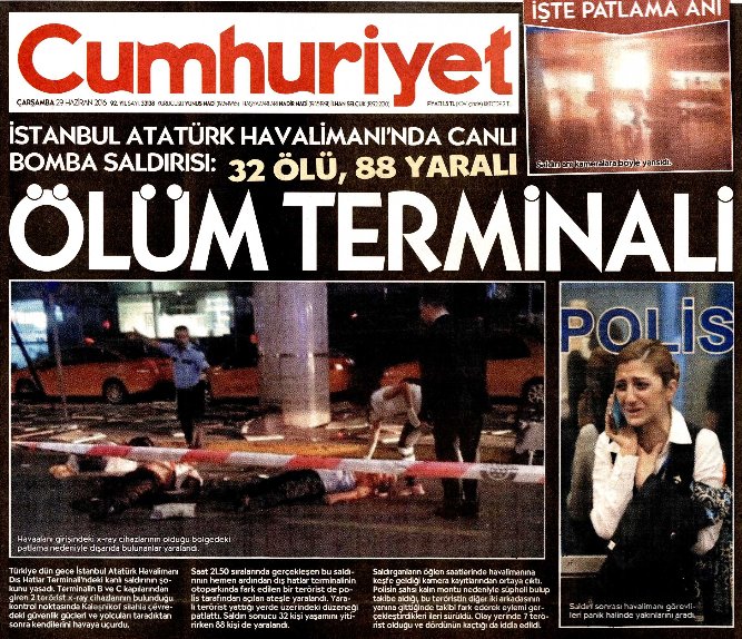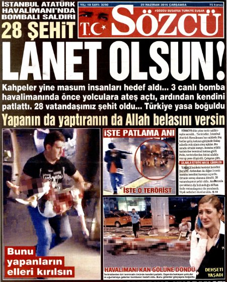 Atatürk Havalimanı’nda düzenlenen hain saldırıdan sonra Sözcü ve Cumhuriyet gazeteleri de ceset-yaralı fotoğraflarını manşetine taşımaktan kaçınmamıştı. Nasıl FETÖ gazeteleri Cumhuriyet ve Sözcü bu haberleriyle bir operasyon çekiyorsa Fransız medyası da kendi ülkesini birşeylere hazırlıyor olmalı ki ceset görüntülerini yayınlamayı bırakın cesetin yanından canlı yayın yaptılar.