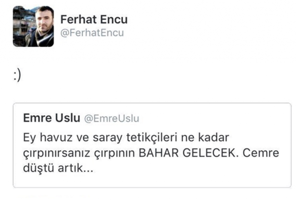 FETÖ’nün operasyonel elemanlarından Emre Uslu, bir süredir söylemeye alıştığı ‘baharda çok güzel şeyler olacak’ tehditlerini, dün paralel yapının en büyük kalesi Zaman gazetesi de düştükten sonra yeniden dillendirmeye başladı.