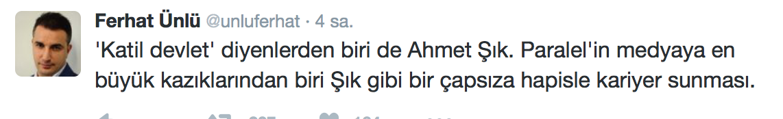 Gülen örgütünün Oda TV kumpas davasıyla hapishaneye atıp, piyasaya “kahraman” olarak sunduğu Ahmet Şık, Diyarbakır’da Tahir Elçi’nin PKK’lı teröristler tarafından öldürülmesinden sonra “Devletiniz teröristtir” tweet’ini atarak, olay açıkça PKK tarafından yapılmışken devleti suçladı. Ahmet Şık’ın hem FETÖ, hem PKK tarafından kullanılan teröristten daha tehlikeli gazetecili maskesini kullanan bir Türkiye düşmanı olduğu tescillendi.
