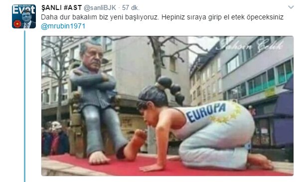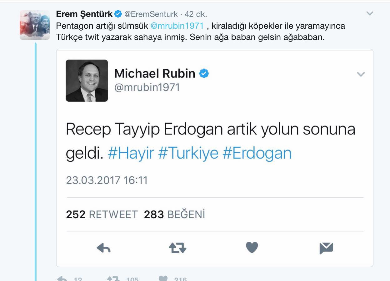 16 Nisan’daki referandumu işaret eden Rubin, “Recep Tayyip Erdoğan artık yolun sonuna geldi” deme küstahlığında bulundu. Amerikalı analistin bu tweet’ine Türk kullanıcılar capslerle cevap verdi.