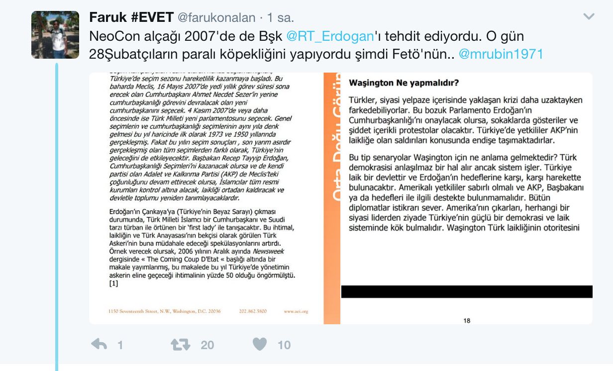 Fetullahçı Terör Örgütü’nün milli iradeye el koyma girişimini tiyatro olarak gören Amerikalı analist Michael Rubin, Cumhurbaşkanı Recep Tayyip Erdoğan’ı hedef aldı.