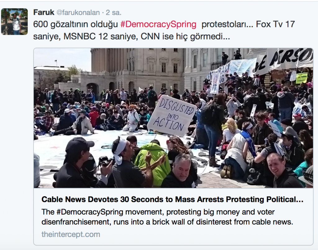 500 gözaltının olduğu Demokrasi Baharı protestolarını Fox Tv 17 saniye, MSNBC 12 saniye, CNN ise hiç görmedi…