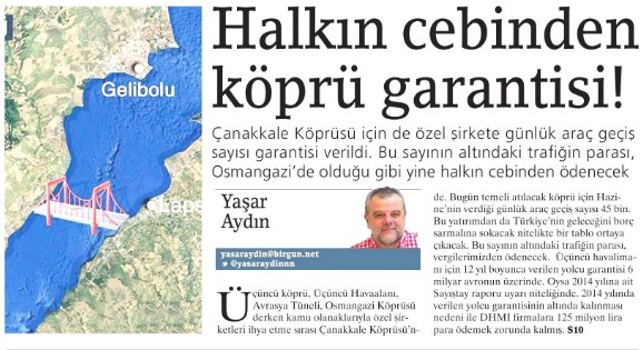 Devletin kasasından tek bir kuruş çıkmadan yapılan projelerin, devletin sırtına yük olduğunu belirten gazete, Çanakkale Köprüsü ile bu yükün ağırlaşacağını yazdı.