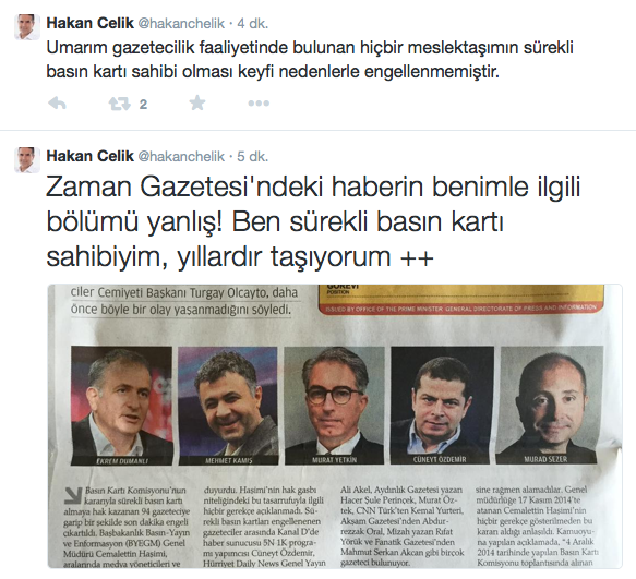 Zaman’ın haberinde 94 gazeteci içerisinde adı geçen, Posta Gazetesi Ankara Temsilcisi Hakan Çelik ise haberin kendisiyle ilgili olan kısmının yalan olduğunu açıkladı.