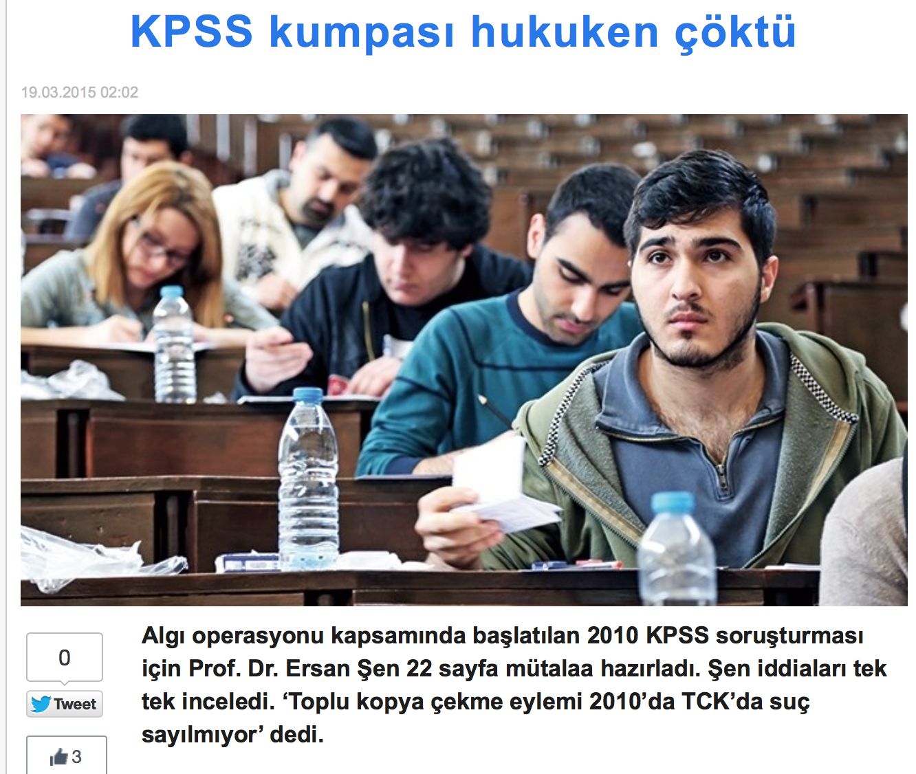 “KPSS kumpası çöktü” başlığıyla verilen haberde, “Algı operasyonu kapsamında başlatılan 2010 KPSS soruşturması için Prof. Dr. Ersan Şen 22 sayfa mütalaa hazırladı. Şen iddiaları tek tek inceledi. ‘Toplu kopya çekme eylemi 2010’da TCK’da suç sayılmıyor’ dedi. Soruların çalındığı iddialarıyla iptal edilen 2010’daki KPSS’de algı operasyonunu çökerten yeni bir bilgi ortaya çıktı. Kumpasın parçası olarak gündeme getirilen kopya iddialarının hukuki temelinin de olmadığı belirlendi.” denildi. Bu ifadelerin tam karşılığı “Soruları çaldık, kopya çektik ama suç değil ki” demek….