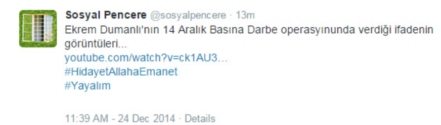 MEDYAGUNDEM.COM- Gülen örgütüne yönelik 14 Aralık operasyonuyla gözaltına alınan Zaman Gazetesi Genel Yayın Yönetmeni Ekrem Dumanlı’nın hakim karşısında verdiği savunmanın kamera kayıtları Gülen çetesi tarafından internete sızdırıldı. Pensilvanya’dan yönetildiği bilinen Twitter’daki Sosyal Pencere (@sosyalpencere) hesabının Youtube üzerinden yayınladığı görüntülerde Ekrem Dumanlı’nın mahkemedeki görüntüleri dikkat çekiyor. Görüntülere bakıldığında hakimin hemen arkasında olan resmi kayıtların tutulduğu adliye kamerasına ait görüntüler olduğu anlaşılıyor. Resmen mahkeme kayıtlarını adliyedeki casusları eliyle çalan Gülen örgütü, suç olan o görüntüleri yayınlamaktan da geri durmayarak, hukuk tanımadığını bir kez daha gösterdi.