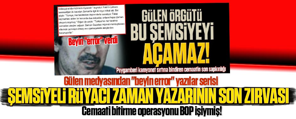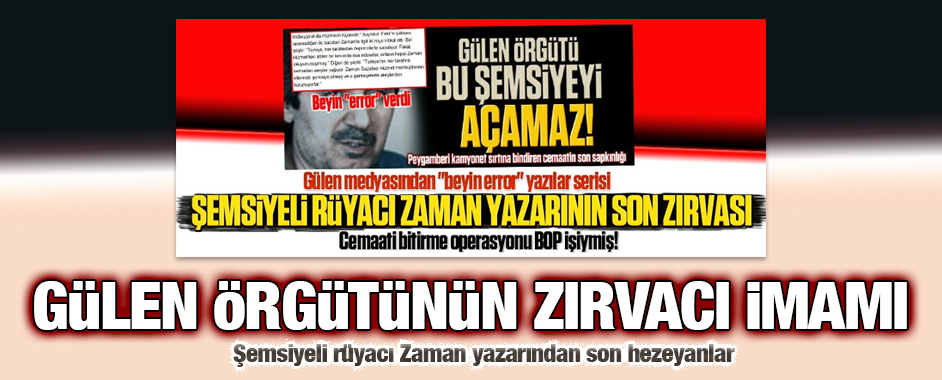 MEDYAGUNDEM.COM- Zaman gazetesindeki köşesinde “Türkiye’nin her tarafına semadan ateşler yağıyor. Zaman Gazetesi Hizmet mensuplarının ellerinde şemsiye olmuş ve o şemsiyelerle ateşlerden korunuyorlar.” diye şemsiyeli rüya paylaşarak Gülen örgütünün “zırvacı imamı” olarak ortaya çıkan Ali Ünal hezeyanlarına devam ediyor.