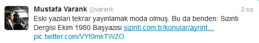 İşte bu duruma manidar bir göndermeyle Başbakan Erdoğan’ın danışmanlarından Mustafa Varank Twitter’da “Eski yazıları tekrar yayınlamak moda olmuş. Bu da benden: Sızıntı Dergisi Ekim 1980 Başyazısı” notuyla Fethullah Gülen’in darbe yapan askere selam durup, “hızır gibi imdadımıza yetiştiniz” dediği yazısını paylaştı.