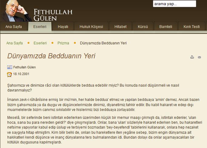 15 Mart 2007’de de “Beddua ve Allah’a Havale Etmek” yazısında Gülen bedduayı reddetmişti.
