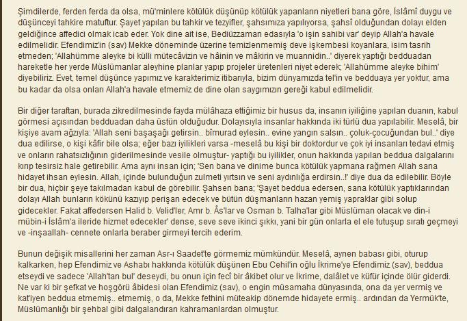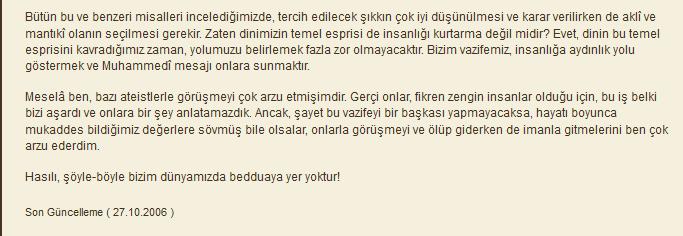 Çünkü kendi internet sitesinde de yer alan değişik konuşmalarında kesin biçimde bedduanın “bedduaya sakın amin demeyin” diyor.