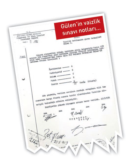 Diyanet İşleri’nin arşivindeki belgelere göre, Fethullah Gülen vaizlik sınavını kıl payı kazanabilmiş. Din İşleri Yüksek Kurulu da Gülen’le ilgili şu kararı almış: İlgili ayet ve hadisleri risalesine almamış. Konuyla alakasız sözler zikretmiş.
