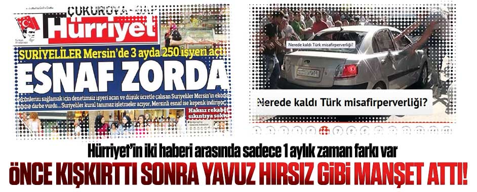 MEDYAGUNDEM.COM- Hürriyet’in Çukurova ekinde 1 ay önce çıkan şu habere bakın: Haber tam bir kışkırtma… Suriyelilere karşı vatandaşı tahrik eden, provokasyon amaçlı bir haber… Şimdi de bugün Hürriyet’te yer alan şu habere bakın: 1 ay önce Türkler’i Suriyeliler’e karşı kışkırtan Hürriyet, tam bir “İngiliz şeytanlığı” ile çıkmış “Hani Türkler ırkçı …