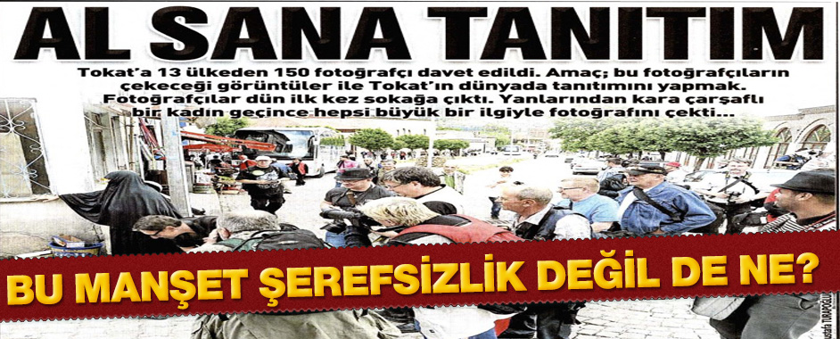 Tokat’ta yabancı fotoğrafçılar, çarşaflı bir kadının fotoğrafını çekince Posta manşet attı: “Al sana tanıtım.” ‘Türkiye’nin en çok satan gazetesi’ sloganı yerine ‘Türkiye’nin en sevilen gazetesi’ sloganını kullanan Posta Gazetesi, bugünkü manşetiyle tepkilerin odağı haline geldi. “AL SANA TANITIM” Tokat’ta 150 yabancı fotoğrafçının katıldığı etkinliği manşetine taşıyan gazete, çarşaflı bir kadının …