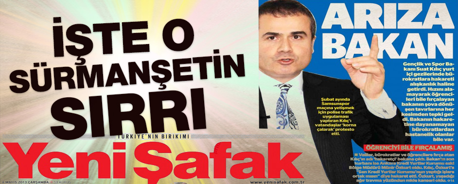 Yeni Şafak gazetesi bugün bir bakanı, sürmanşetinde “ARIZA BAKAN” ve “FIRÇA BAKANI” başlıkları ile hedef tahtasına oturttu. Peki bu başlıklar ile bakana saldırılmasının asıl sebebi ne? Yeni Şafak gazetesi bugün Gençlik ve Spor Bakanı Suat Kılıç’a bildik tabirle çakan bir masabaşı manşet attı. Haberin detayında bakan için artı puan sayılabilecek …