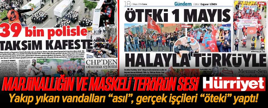 MEDYAGUNDEM.COM- Hürriyet gazetesinin bugünkü nüshası gazetecilik okullarında ders gibi okutulacak kadar önemliydi. Önemliydi çünkü “merkez medyanın amiral gemisi” iddiasındaki gazetenin nasıl marjinalleştiğinin, sol terör örgütlerinin sesi haline geldiğinin ve gazeteciliğin nasıl provokasyon amaçlı kullanıldığının ibretlik vesikası oldu. Hürriyet gazetesi ortalığı yakıp, yıkan, linç eden ve yağmalayan maskeli teröristleri, vandalları görmedi, …