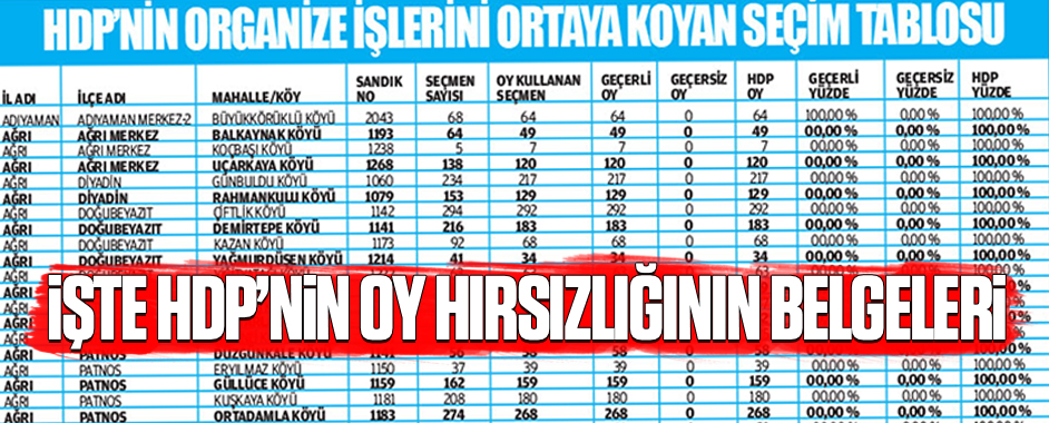 Türkiye genelinde 11 ilin 33 ilçesine bağlı 135 köyde kurulan sandıklarda hiç geçersiz oy çıkmamış, 135 köyde kullanılan oyların tamamını da HDP almış! Ortaya çıkan tablo hileli görünüyor. Akit, HDP’nin seçim hilelerini deşifre etmeye devam ediyor. Türkiye genelinde 11 ilin 33 ilçesine bağlı 135 köyde kurulan sandıklarda hiç geçersiz oy …