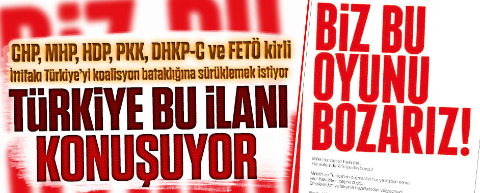 Türkiye 7 Haziran seçimlerine kilitlendi. CHP, MHP, HDP, PKK, DHKP-C ve FETÖ’den oluşan kirli ittifak Türkiye’yi koalisyon bataklığına sürüklemek için bütün gücüyle saldırıyor. Sivil Dayanışma Platformu bugün gazetelere verdiği bir ilan ile sandığa gitmeyen her seçmene “Oy ver bu oyunu boz” çağrısı yaptı. İŞTE ÇOK TARTIŞILAN SİVİL DAYANIŞMA PLATFORMU’NUN O …